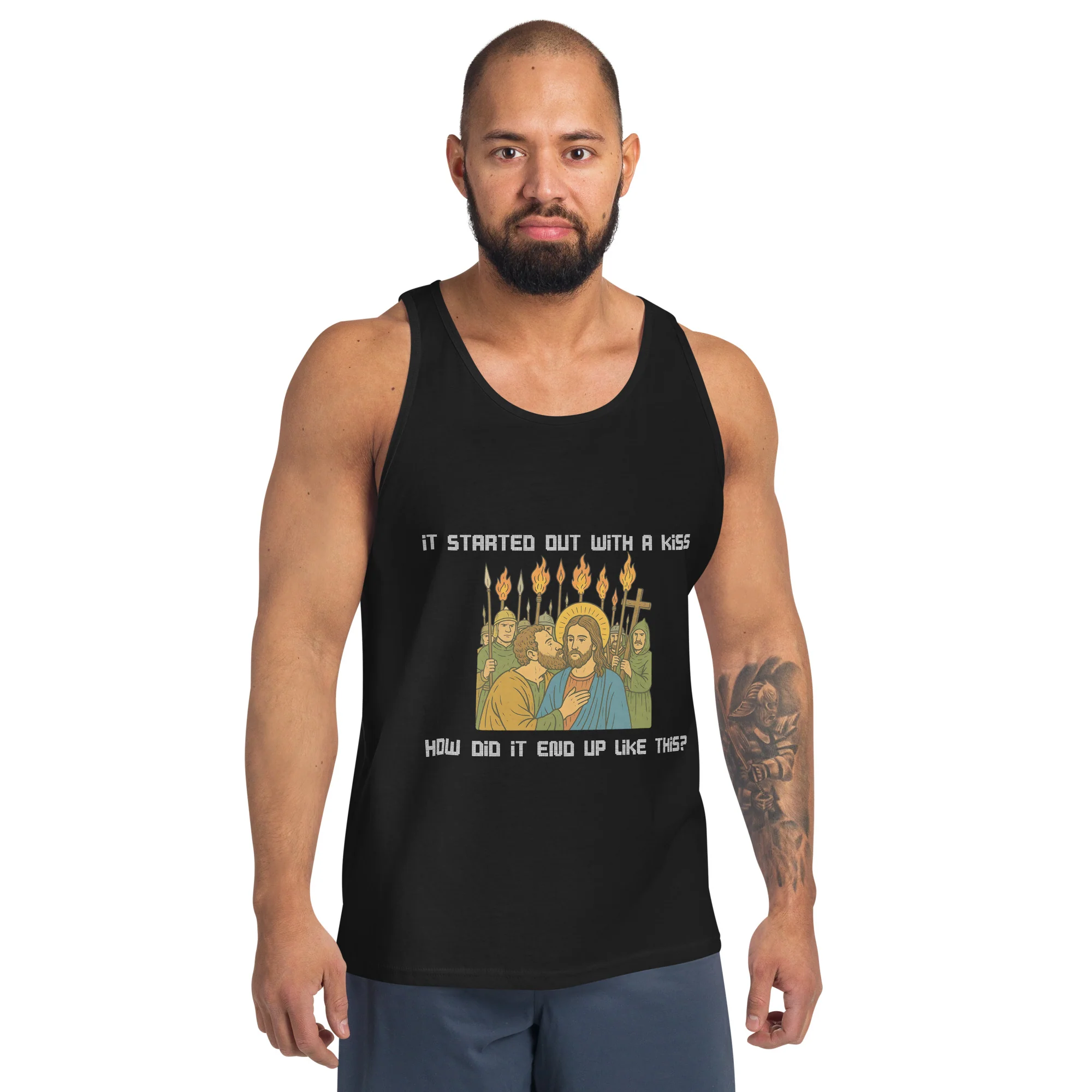 Tank Top featuring our iconic It was only a kiss How did it end up like this Jesus & Judas design.